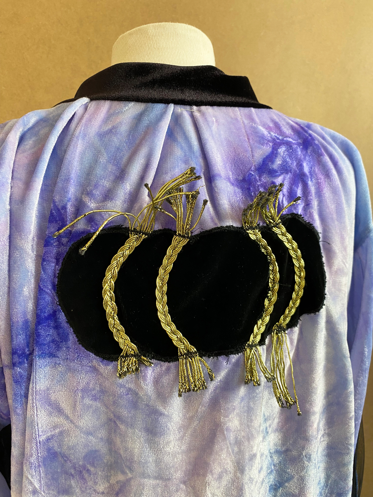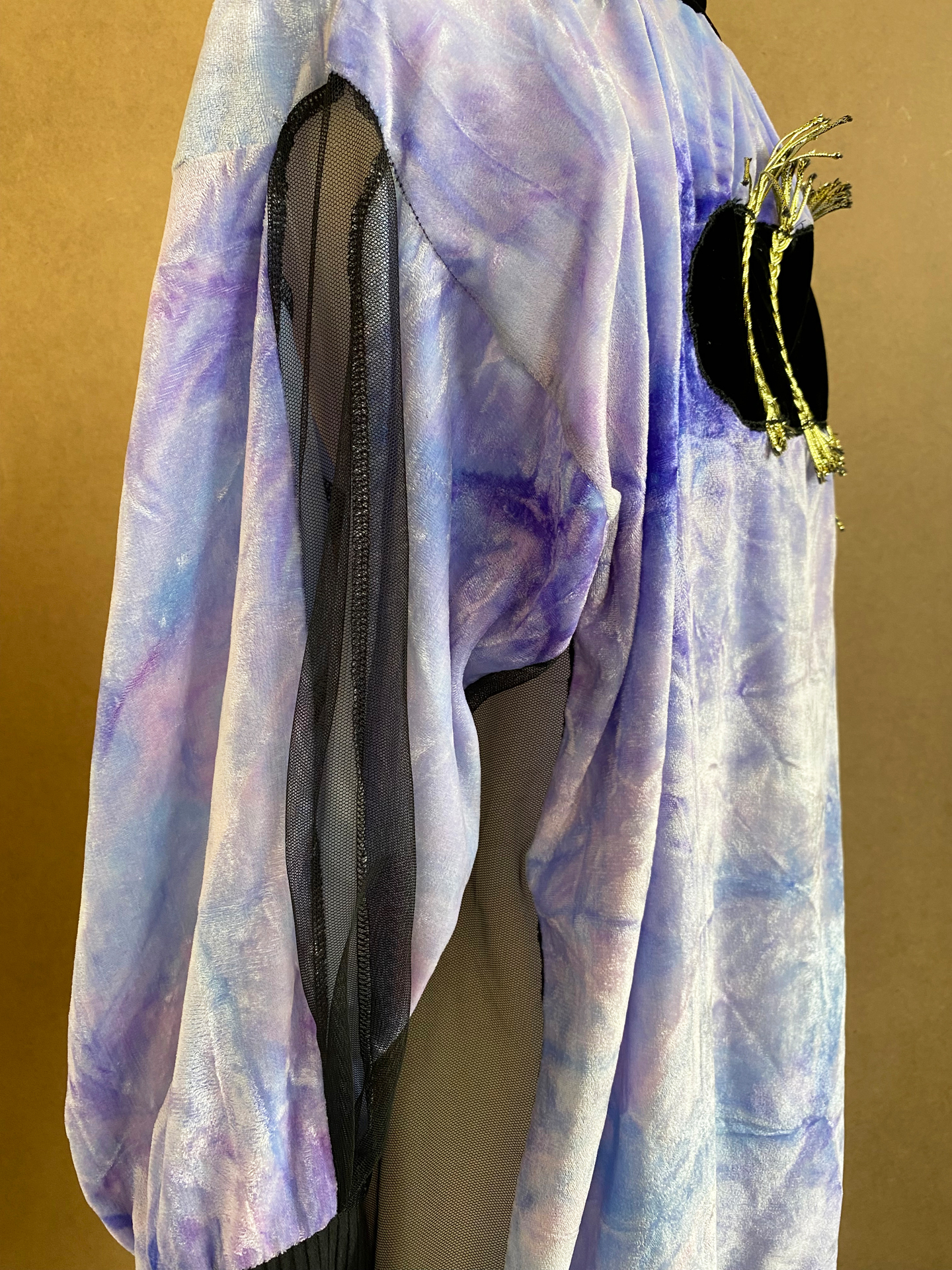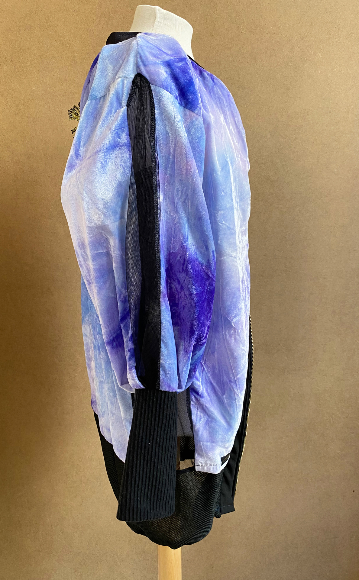 Lila blaue oversized Jacke mit Cutouts an den Seiten und Ärmel und appikation am Rücken.